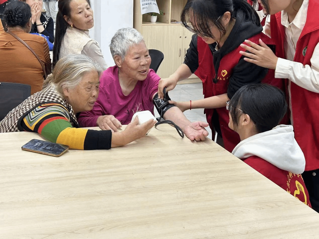 健康守护环节,志愿者们展现出高度的专业素养与责任感,为每位长辈测量血压、检查身体,并结合数据耐心讲解健康要点,内容涵盖饮食的科学搭配、运动的合理建议等各个方面。他们用专业与耐心,为长辈们织就了一道坚实的健康防线。