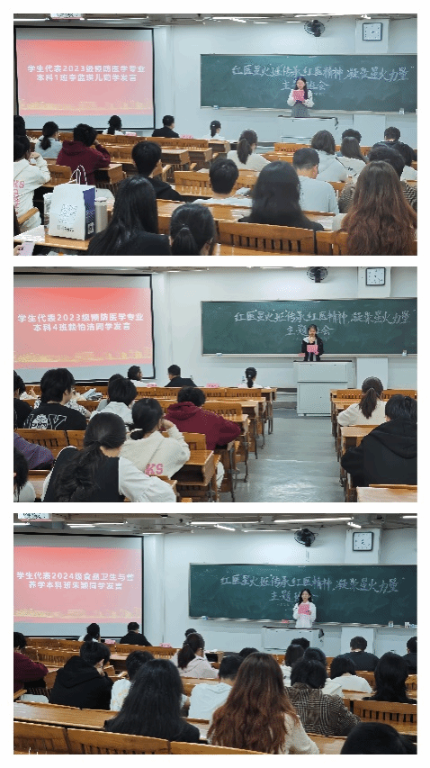 2023级预防医学专业本科一班李蓝琪儿、2023级预防医学专业本科四班赖怡洁以及2024级食品卫生与营养学本科班朱颖作为学生代表依次上台发言,她们结合自身学习和生活经历,分享对红医精神的理解与践行。