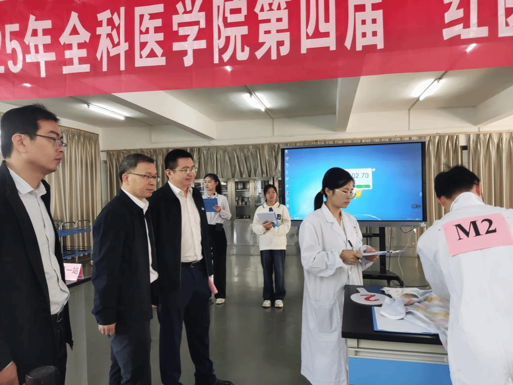 为弘扬红医精神,培养医学生综合技能,11月1日上午,全科医学院在蓉江校区举办2025年第四届“红医杯”医学技能竞赛。学院党委书记廖信伟,党委副书记、院长黄光生,党委副书记朱锦,学院教师代表、参赛选手以及学生志愿者共100余人参加。