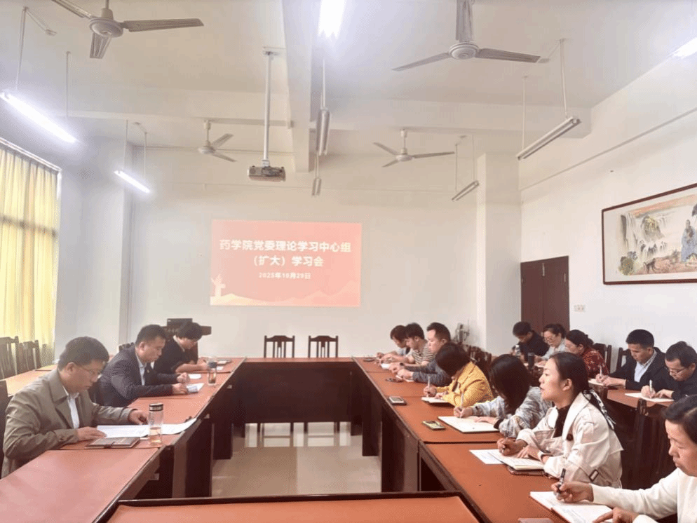 10月29日,药学院党委在蓉江校区召开党委理论学习中心组(扩大)会议,专题学习党的二十届四中全会精神,对全院学习宣传贯彻工作作出全面部署。该院党委领导班子成员、科级干部、各支部书记及副书记、各科室主任及副主任参加会议。