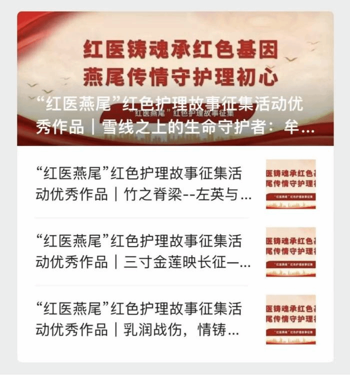 为深入挖掘红色医疗史中的护理力量,引导师生传承和弘扬好红医精神,近期,护理学院组织开展“红医燕尾”红色护理故事征集活动。本次活动由护理学院学生党建工作站承办,围绕红色护理英雄事迹、红色护理历史细节、红色护理独家记忆等内容进行故事征集,全院学生踊跃参与,共征集到70多份作品。