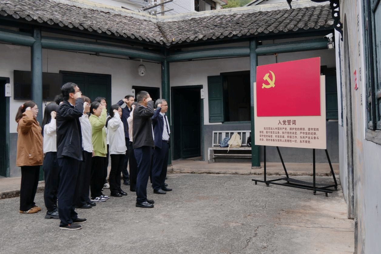 活动中,师生党员沿着革命先辈足迹,在历史现场感悟初心使命。首站来到毛泽东旧居和福音医院,这里是中央苏区红色医疗的核心阵地。斑驳的木桌、批阅的墨迹、褪色的药箱,每一件文物静静陈列,无声诉说着红军与群众的鱼水深情和革命胜利的来之不易。全体师生党员在福音医院旧址重温入党誓词,铿锵有力的誓言在革命旧址上空回荡。
