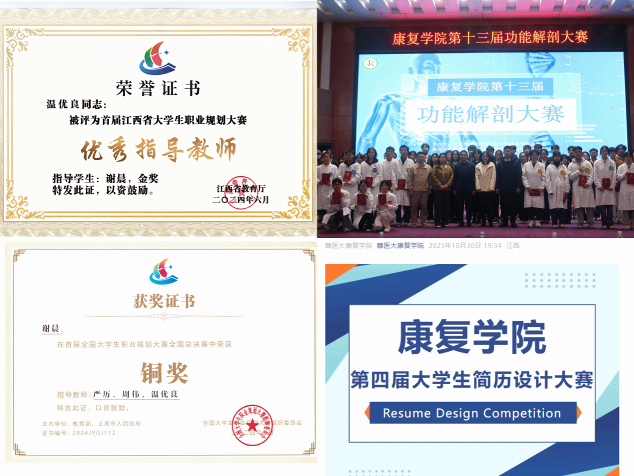 发挥党员先锋模范作用,“以做有温度的康复老师,培养有温度的康复工作者”为育人方针,构建“党员+专业+生涯”复合型指导团队。18名党员教师志愿者、30名党员校友志愿者与20名学生党员组成学业辅导队伍,开展专业讲座7场、学业辅导4次,为学生夯实专业基础。党员导师与同学1+N结对,开展个体生涯咨询、就业指导服务,累计服务学生800余人次,解决职业定位、考研规划等个性化困惑。深化“医我看模式创新”培养体系,将党建与职业技能提升紧密结合。按年级定制“红医+赛事”活动,党员骨干全程参与组织解剖知识大赛、康复技能大赛、简历大赛、职业规划大赛等赛事,以赛促学提升职业竞争力。近三年,学生在全国职业规划大赛、康复专业技能竞赛中斩获国家级奖项5项、省级奖项12项,党员学生获奖占比达60%;特别是近三年,学院党员教师指导学生参加职业规划大赛获得国家铜奖一项、省级金奖一项、省级银奖三项。