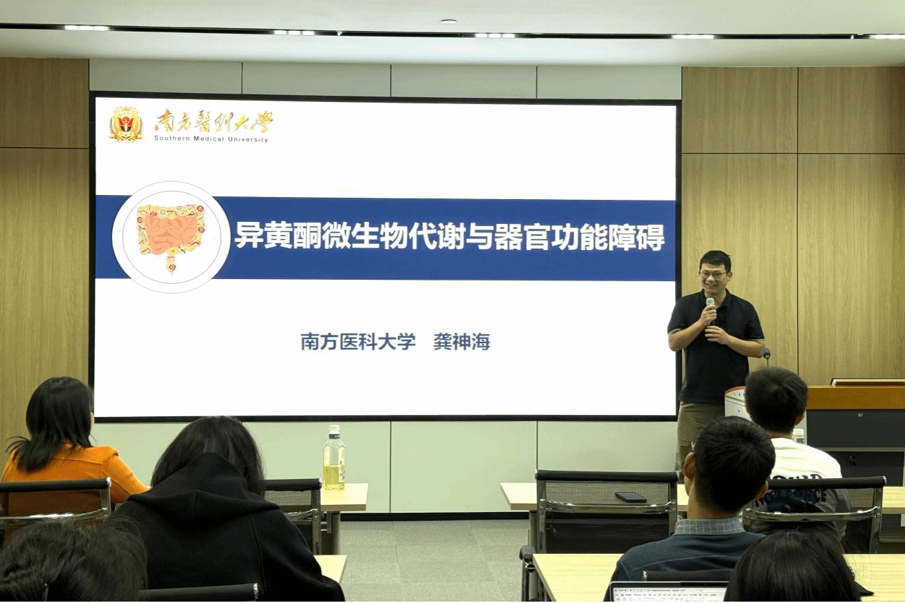 龚神海教授在讲座中介绍了团队近三年在肠道菌群-代谢物轴在器官功能障碍影响的研究成果,深入浅出的从微生物表达β-半乳糖苷酶角度探讨微生物对食物黄酮苷元产物影响妊娠期脓毒症易感性,以及雌雄同笼饲养增强雄性小鼠对乙酰氨基酚诱导肝损伤的抵抗性。提出了解肠道微生物群和器官功能障碍之间的相互作用可能是未来相关疾病干预的重要方向。