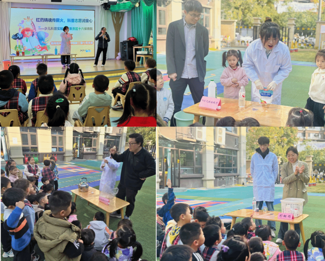 为打造趣味盎然的沉浸式科普课堂,充分激发孩子们的科学好奇心与探索欲,党支部精心设计了一系列兼具知识性与趣味性的科普实验,让“化学就在身边”的理念深植童心。活动现场,“变色魔法水”“彩虹雨”“梦幻泡泡火山”“水中跳舞的鸡蛋”“会吹气球的瓶子”“绚烂的熔岩”等趣味实验轮番上演,奇妙的科学现象瞬间点燃了小朋友们的参与热情。孩子们围坐实验桌前,眼神专注、屏息观察,现场欢呼声此起彼伏,气氛热烈。