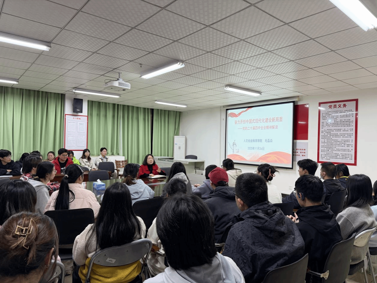 为深入学习贯彻党的二十届四中全会精神,引导青年学生党员坚定理想信念,准确把握时代脉搏,11月26日,人文社会科学学院党委副书记毛磊焱为该院学生党员带来了题为《奋力开创中国式现代化建设新局面——党的二十届四中全会精神解读》的专题讲座。