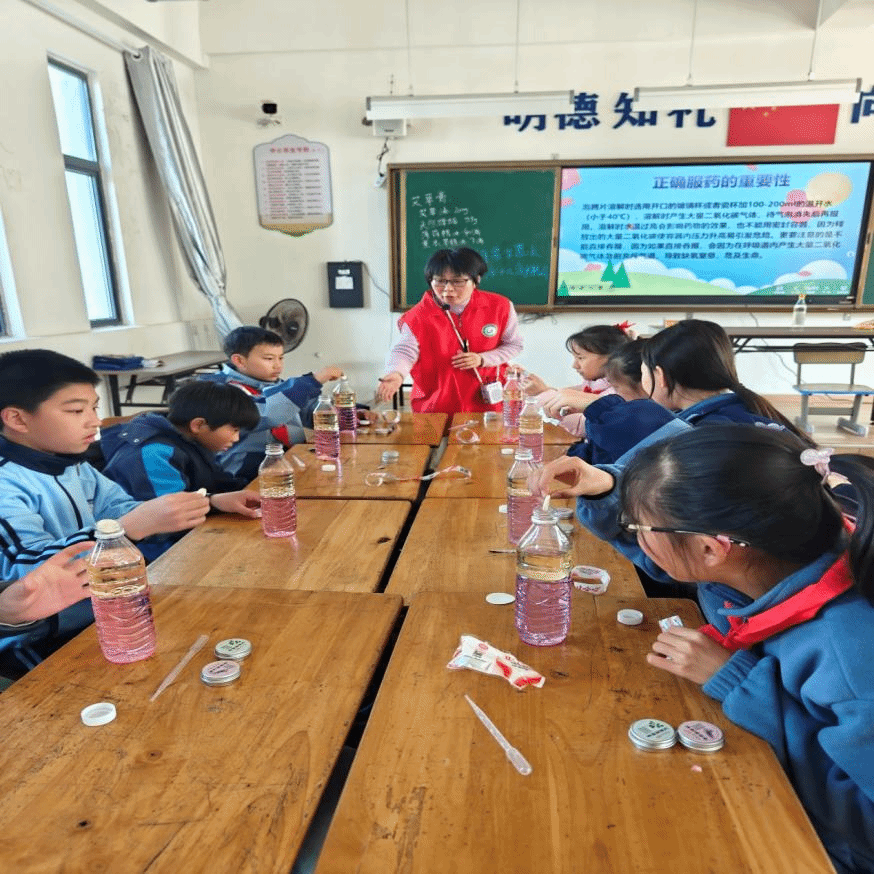 从科学原理到医药应用的延伸讲解,更让课堂价值倍增。“维生素C泡腾片要溶解后喝,就是利用气泡提升吸收效果”“肠胃胀气时的产气药,也是靠气体缓解不适”,“红药匠”志愿者将泡腾片的医药属性与实验原理相结合,让孩子们清晰感知“科学服务健康”的意义。这种“实验现象—原理解析—生活应用”的教学模式,既培养了孩子们的科学思维,更激发了他们探索生活中医药知识的兴趣。