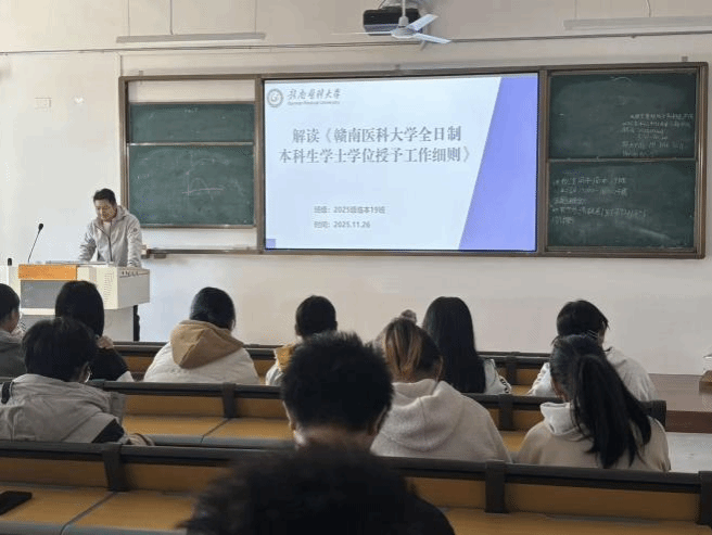 在学位授予细则解读环节,班主任围绕《赣南医科大学全日制本科生学士学位授予工作细则》,拆解授予条件、不授予情形及补救机会,重点强调核心要求,结合优秀学业规划案例与常见学业问题答疑,帮助学生明晰学业目标、规范学业行为,夯实学术根基。