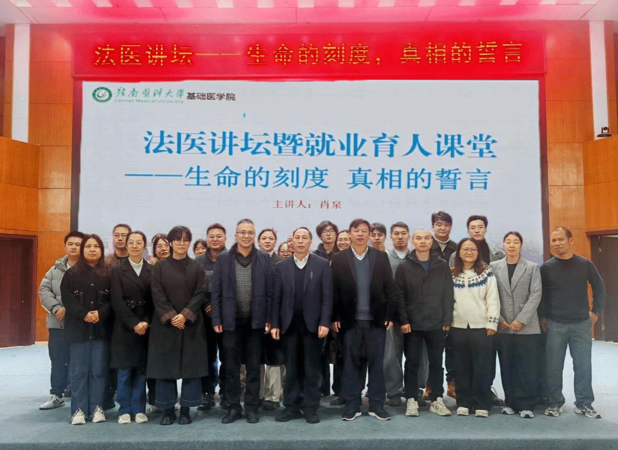 12月21日晚,由基础医学院、司法鉴定研究所联合主办的“法医讲坛(第二讲)暨就业育人课堂”在蓉江校区开讲。讲坛特邀赣州市公安局刑侦支队政委、主任法医师肖泉担任主讲。活动由司法鉴定研究所所长汪家文主持,基础医学院党委副书记刘志春出席,基础医学院及其他学院部分师生代表、司法鉴定研究所全体员工共计200余人到场聆听。