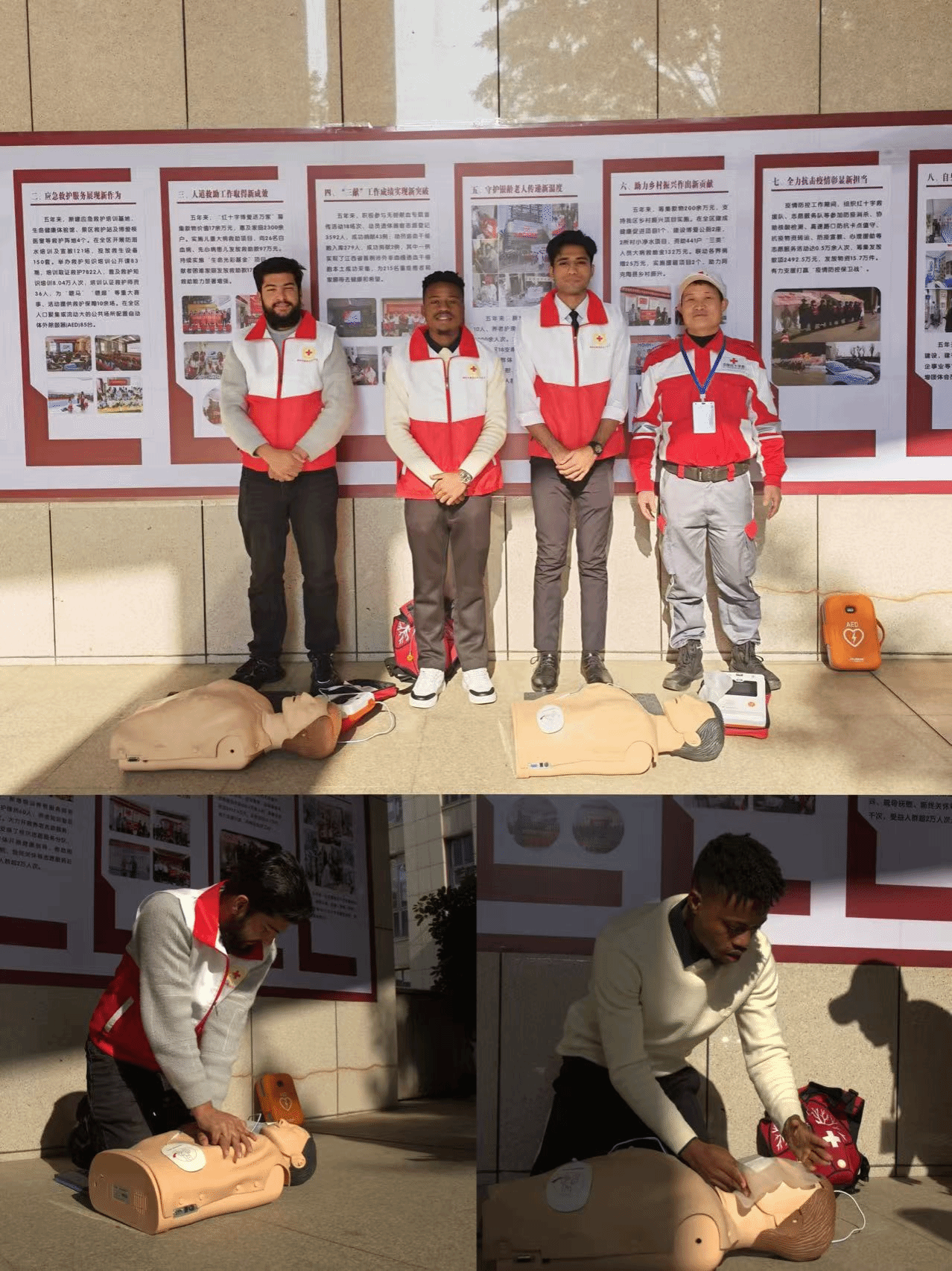 大会结束后,三位留学生参加应急救护技能实操培训,培训内容包括心肺复苏(CPR)、自动体外除颤器(AED)的使用以及创伤包扎等基础急救技能。