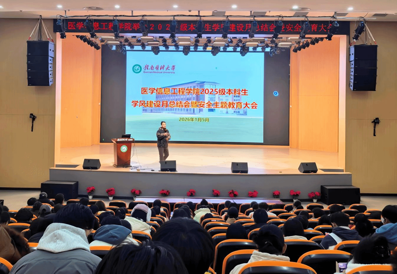 以“红医魂”为引领,筑牢学风根基与安全防线。1月5日,医学信息工程学院在龙南校区召开2025级本科生学风建设月总结会暨安全主题教育大会,学工办辅导员、367名本科新生共同参会。该院辅导员陈君伟主持会议。