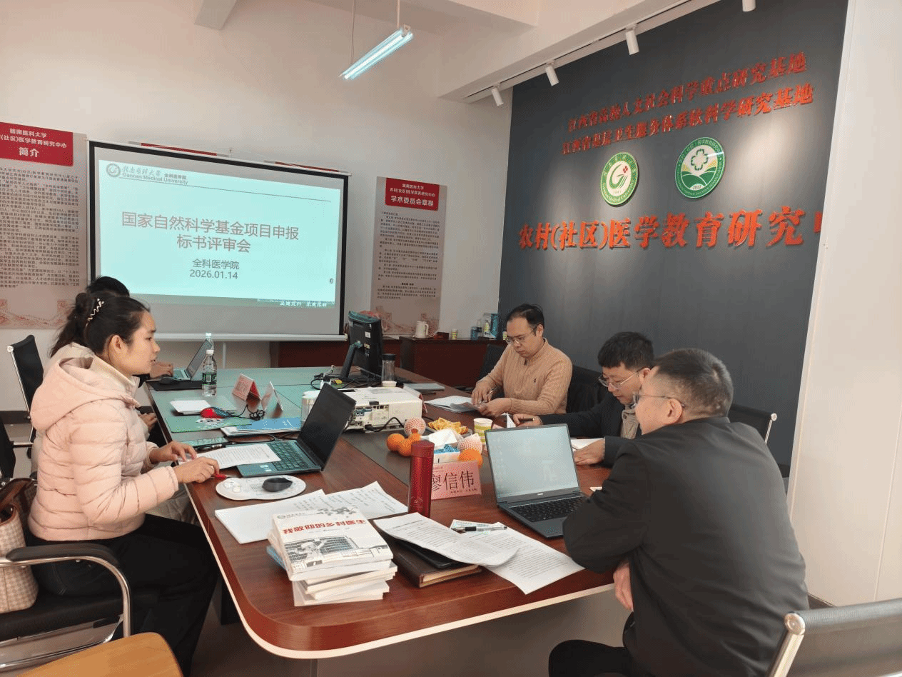 1月14日,全科医学院在蓉江校区举行国家自然科学基金项目申报评审会,特邀药学院党委委员、副院长黄浩教授,科研中心钟佳宁副教授对申报项目进行指导。学院党委书记廖信伟主持会议。