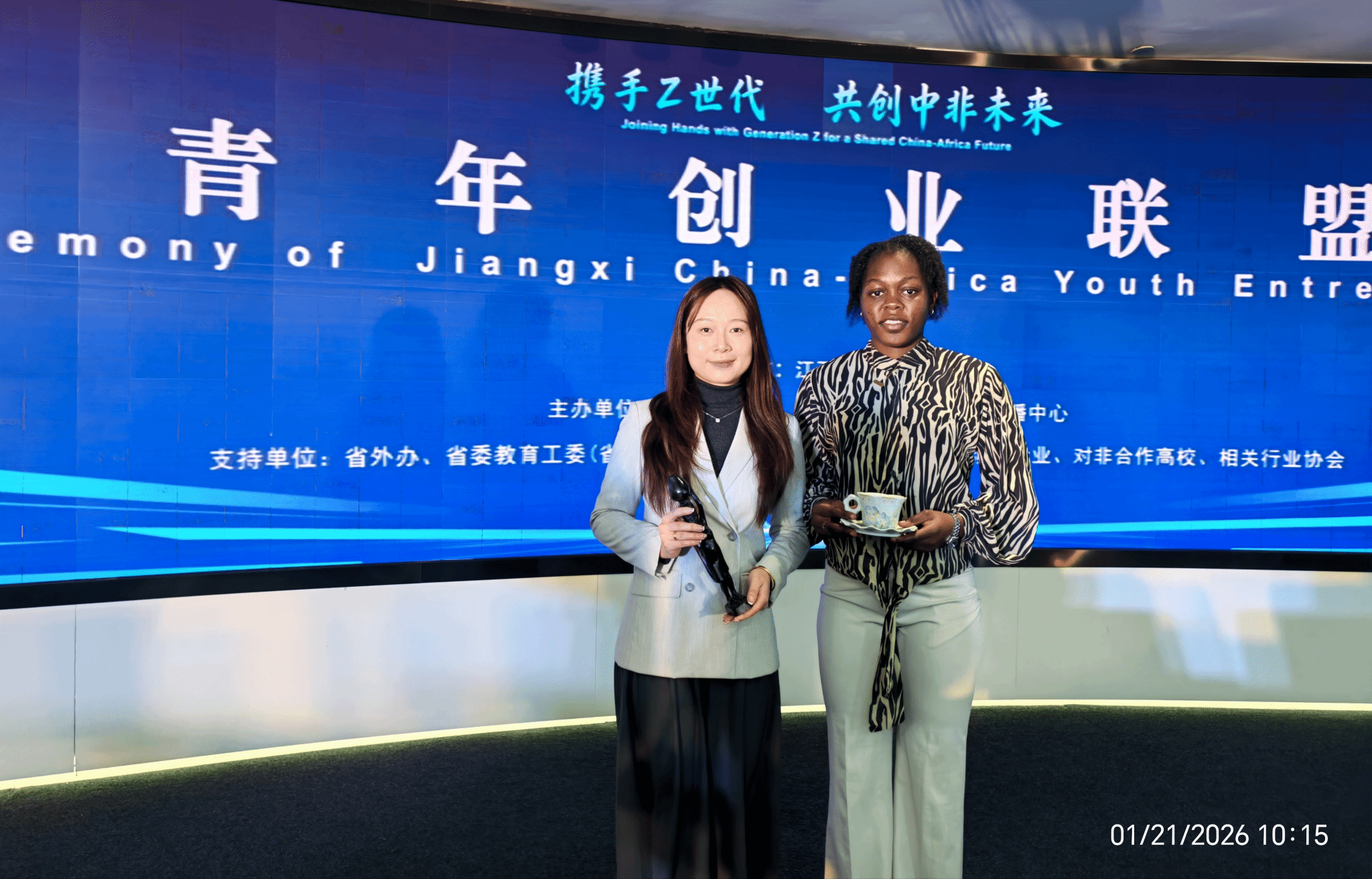 2026年1月21日,由江西日报社主办,江西国际传播中心承办的江西中非青年创业联盟成立暨项目支持网络签约仪式在南昌成功举行。我校喀麦隆籍2025级临床医学专业留学生FREDERIC SHANICE MBAHA MBIELEU(中文名莎莉思)作为非洲青年代表参加了此次活动并进行了发言。