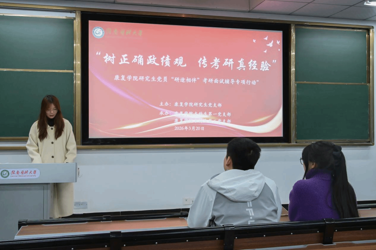 为深入开展树立和践行正确政绩观学习教育,把为民造福落到实处,切实为考研学子办实事、解难题,助力学子圆梦研途,3月20日,康复学院在蓉江校区开展“研途相伴”考研面试辅导专项行动,邀请该院研究生党支部成员原苗苗、李晓娟进行分享,研究生党支部书记高莹、部分在校本科学生共计120余人参加。