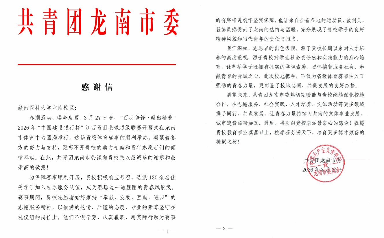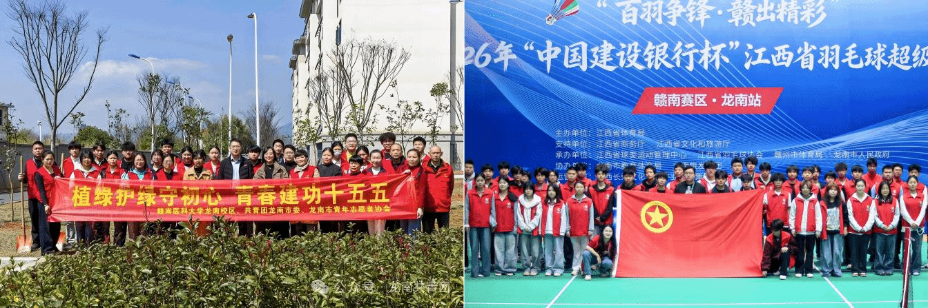 校团委、龙南校区管理办立足育人根本,精准对接地方需求,推动志愿服务与专业特色、校地共建深度融合。在绿色发展实践中,选派20余名师生志愿者参与共青团龙南市委“我为绿色发展植棵树”暨创建“江西青年双碳林”主题活动,以实际行动践行生态文明理念,彰显红医青年的社会责任感;在省级赛事服务中,选派130余名师生志愿者投身“百羽争锋·赣出精彩”2026年“中国建设银行杯”江西省羽毛球超级联赛开幕式及后续赛事保障,志愿者们坚守礼仪服务等岗位,以饱满热情、专业素养完成各项工作,获共青团龙南市委专门来函致谢,充分展现赣医学子的良好风貌。