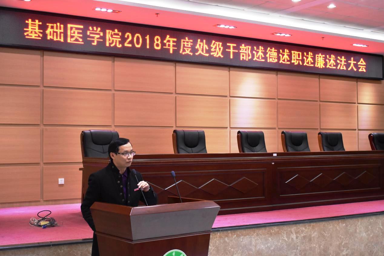 1月8日下午,基础医学院党委举行2018年度处级干部述德述职述廉述法。该院党政领导班子成员、全院教职工及部分学生代表参会。该院党委书记颜剑主持会议。