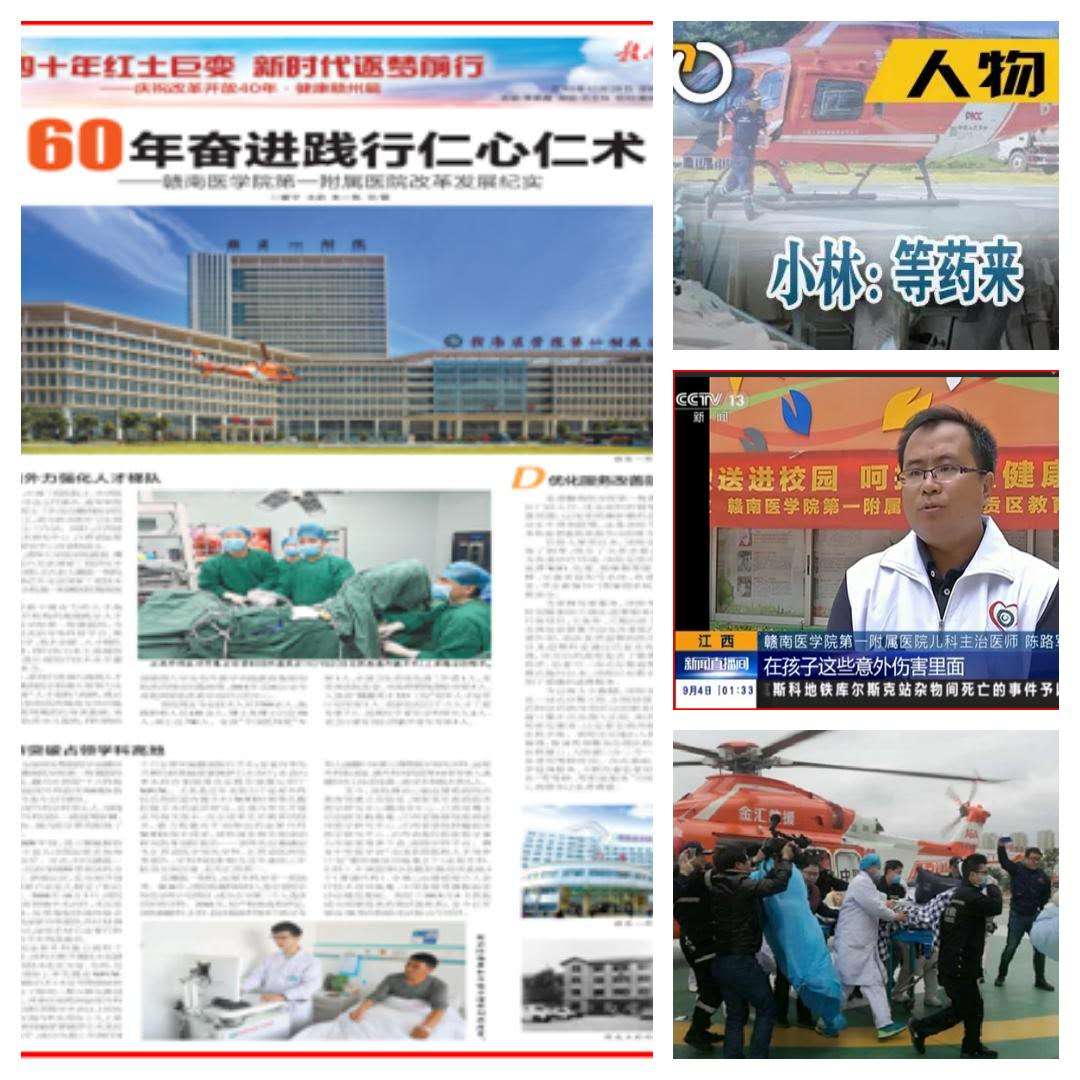 该院注重党建引领,加强对外宣传,中央媒体报道医院先进典型事迹4次,省级媒体报道85次,市级媒体上报道119次。2018年7月17日,中央电视台报道该院急诊科医生火车上紧急救治患者的故事;8月25日,中央电视台新闻周刊人物板块、《24小时》栏目报道该院参与全城“爱心大接力”、跨国接力营救的故事;9月4日,中央电视台《新闻直播间》报道该院陈路军医生变身老师现场教授儿童应急处理知识,呵护儿童健康安全的相关事迹;11月26日,人民周刊网、中国江西网等媒体专题报道该院泌尿外科临床NOTES技术开创者邹晓峰的先进事迹;12月28日,《赣南日报》刊出该院60年奋进践行仁心仁术的改革发展纪实专题报道。