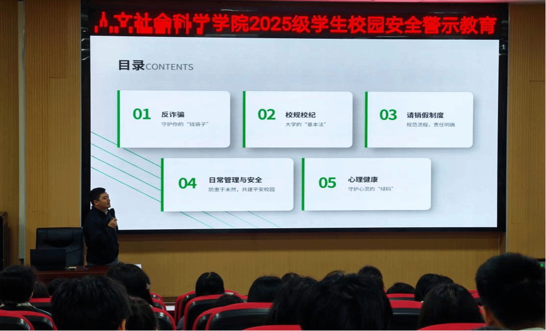 会上,郭伟卫结合校园管理现状与假期安全形势,围绕纪律要求、学业管理、假期安全、心理健康等多个维度展开,深入解读了校规校纪、请销假规范、“三个文明”要求,并重点普及了反诈知识、宿舍消防安全及出行安全指南。