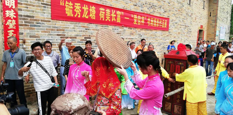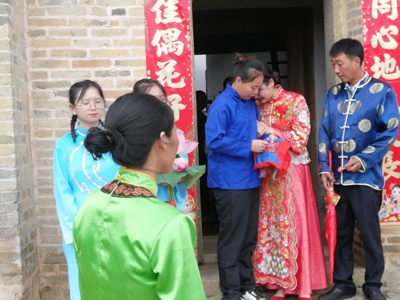 我校在定南县开展“小药箱”留守儿童健康扶贫专项行动期间,恰逢定南龙塘荷花文化旅游节开幕,在为期4天的旅游节“客家哭嫁”节目中,我校志愿者和温州医科大学的志愿者“喜结连理”,扮演新郎新娘以及伴娘喜娘,为旅游节增添了一道亮丽的风景,助力传承客家传统文化。