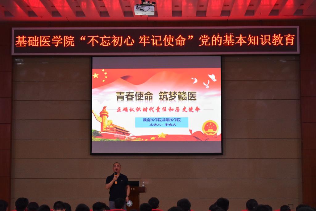 10月16日晚,基础医学院开展了2019级新生“不忘初心,牢记使命”党的基本知识教育活动。基础医学院专职组织员李晓文以“青春使命,筑梦赣医——正确认识时代责任和历史使命”为主题开始了入学教育讲座。