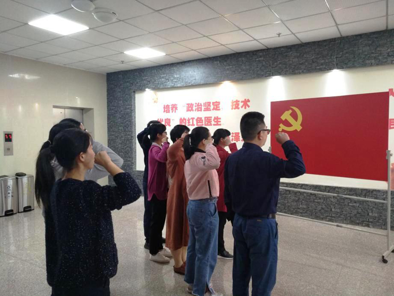 作为主题教育党员集中培训的一环,全体党员在博物馆门口面对鲜红的党旗,高举右手,神情肃穆,重温了入党誓词。
