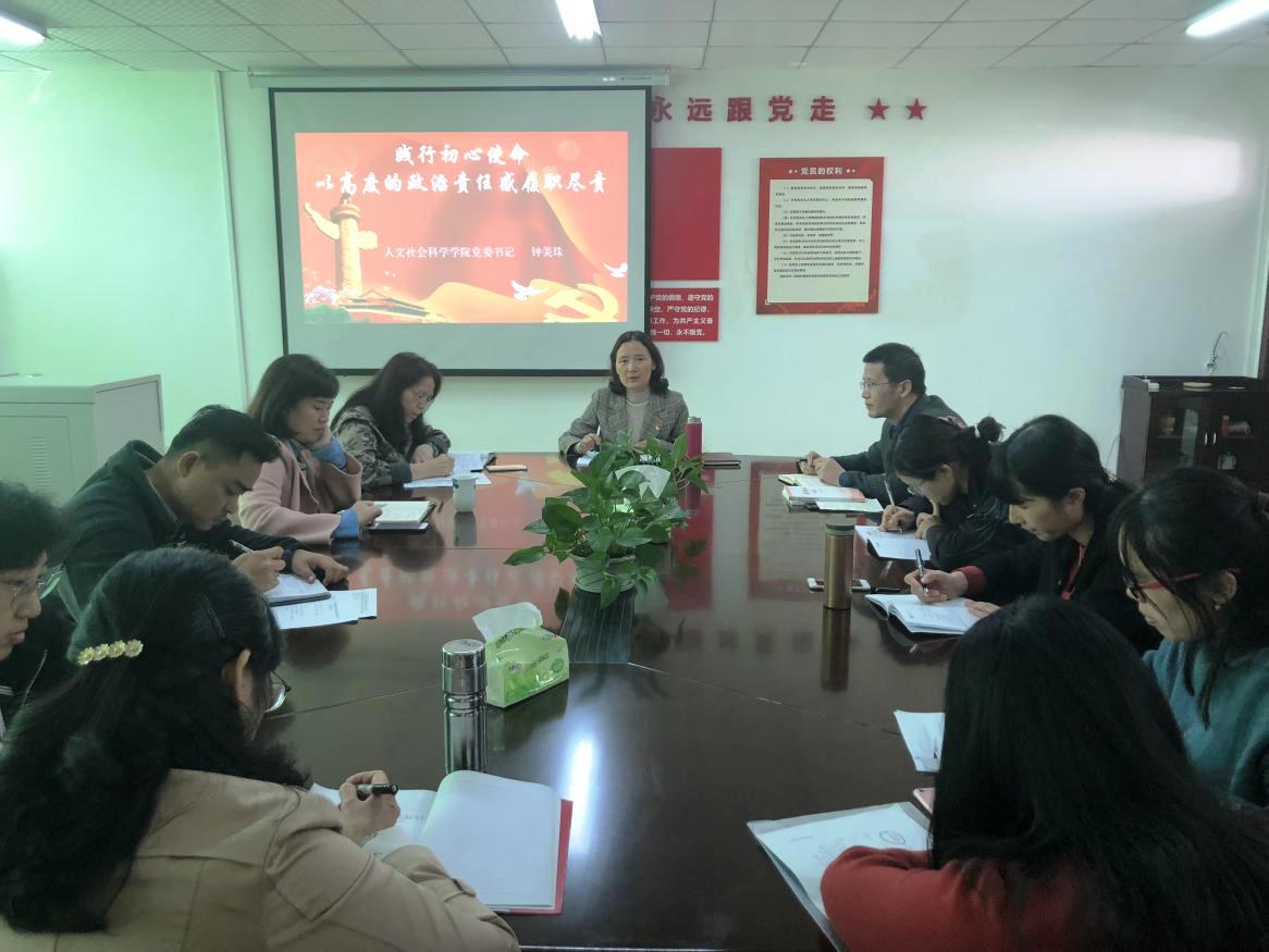 10月29日下午,人文社科学院开展主题教育专题党课。该院党委书记钟美珠作了以《践行初心使命,以高度的政治责任感履职尽责》为题的“不忘初心、牢记使命”专题党课。全体教工党员参加专题党课。