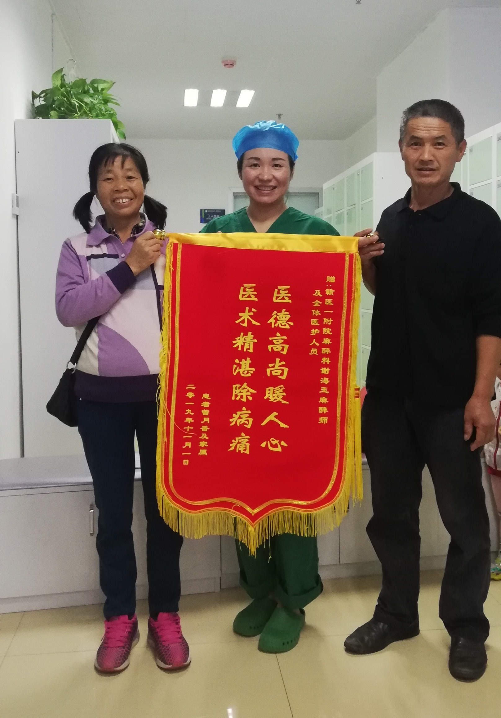 术后,曾女士恢复良好,于11月4日康复出院。曾女士一家人异常高兴,特地做了一面锦旗赠给麻醉科谢海玉医师及全体麻醉科手术室医护人员,赞扬他们“医德高尚暖人心,医术精湛除病痛”,并与谢海玉医师合影留念。