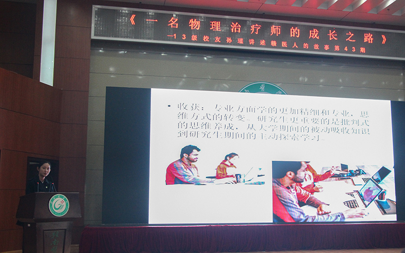 2013级康复治疗学专业的校友孙瑾以《一名物理治疗师的成长之路》为主题,从生活、学习、工作等方面向大家介绍了她的国外求学成长之路,鼓励学弟学妹在校期间学习要主动探索,为考研、就业提前做好充分准备。