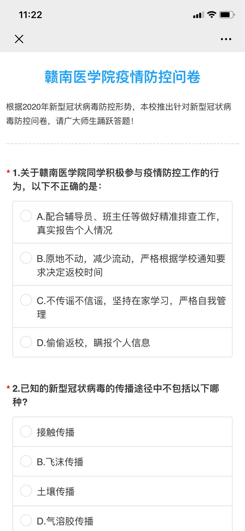 测试题以网络问卷形式将链接转发到学生微信群,倡议全校学生积极参与,认真学习新型冠状病毒防治知识,全面掌握新型冠状病毒防治知识。测试题共20道选择题,时间为10分钟,满分100分, 近11000名学生参与答题。