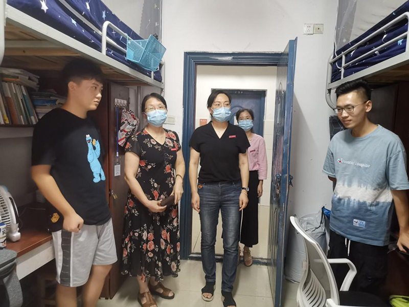 8月31日,人文社科学院党委书记连璐,党委副书记、院长焦培慧走访黄金校区7、8栋学生宿舍,查看内务、慰问学生。