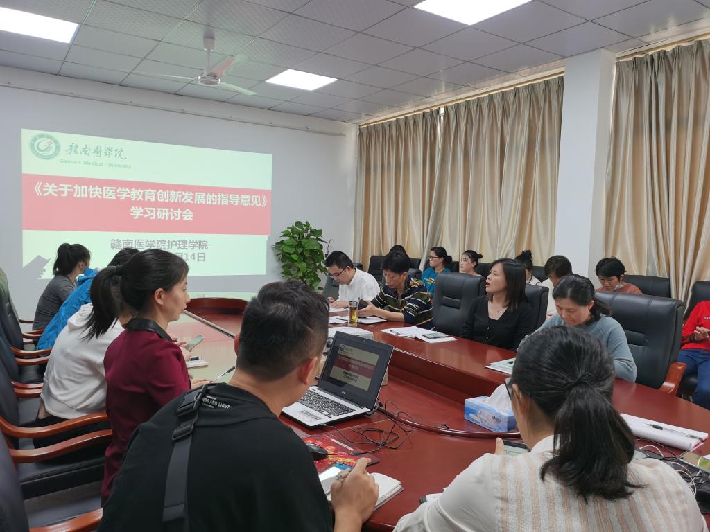 10月14日,护理学院召开学习研讨会,深入学习国务院办公厅印发的《关于加快医学教育创新发展的指导意见》(以下简称“《意见》”)文件精神,丁梅院长主持会议,全体教职工参会。
