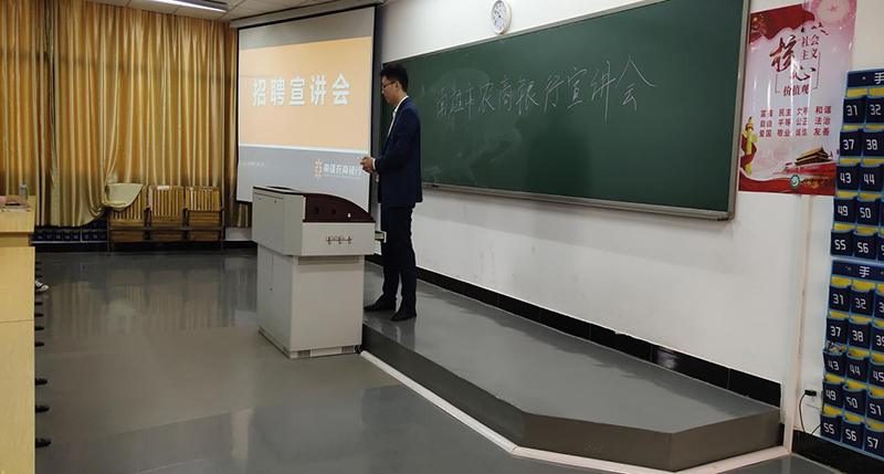 农商银行招聘团队通过播放宣传片、PPT展示的方式介绍该银行的企业文化、薪资福利、工作内容等基本情况,并将本次招聘流程及有关要求进行了详细的说明,希望即将毕业的同学投递简历和参加面试。