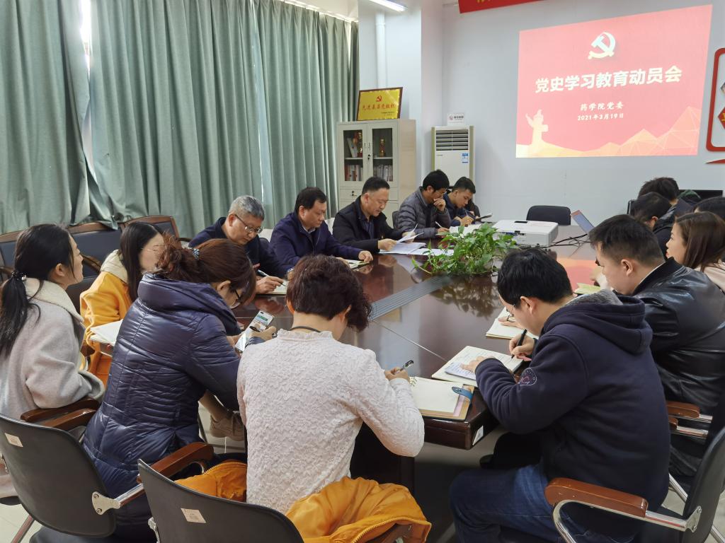 会议传达学习了习近平总书记在党史学习教育动员大会上的重要讲话精神,省委、省委教育工委和学校党委党史学习教育动员会精神,学习了学校党委《关于在学校开展党史学习教育的实施方案》,并对药学院党史学习教育进行了安排布置。