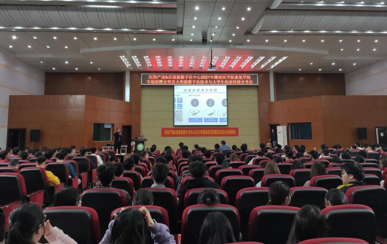 3月25日,广州派康运动医学有限公司俞开平,广州伍阳产康&派康筋膜手法中心陈婷、莫致燊一行,应邀在我校黄金校区举办意大利筋膜手法技术讲座并进行了校园专场招聘。康复学院院长温优良、副院长王茂源、教研室专业教师及学生400余人到场聆听,活动由温优良院长主持。