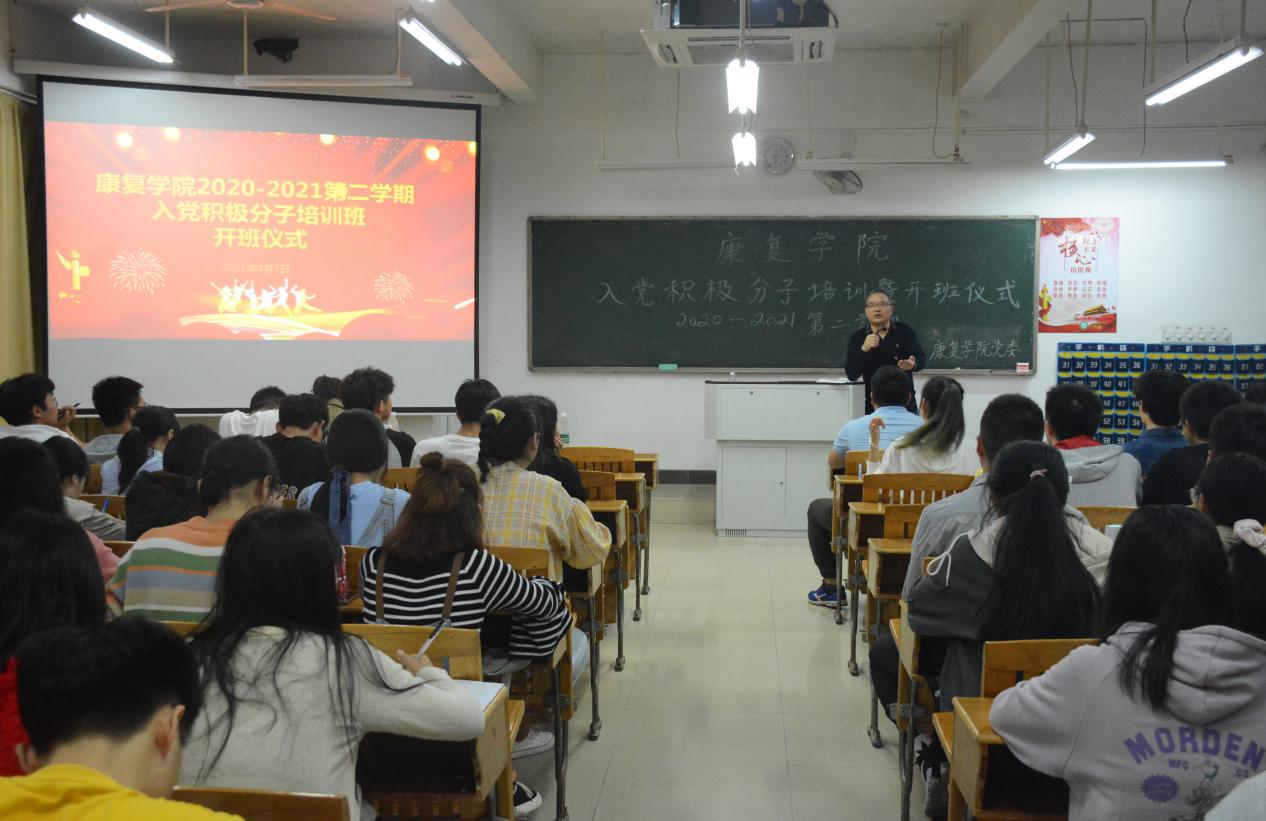 4月7日晚,康复学院在黄金校区开展2021年上半年入党积极分子培训开班仪式暨第一次党课。该院党委书记陈建文、党委副书记叶贞丽出席,学生党支部书记雷飘、学工办主任袁阳康、辅导员周伟以及全体入党积极分子参加。