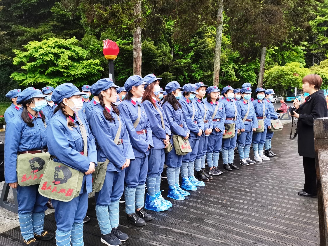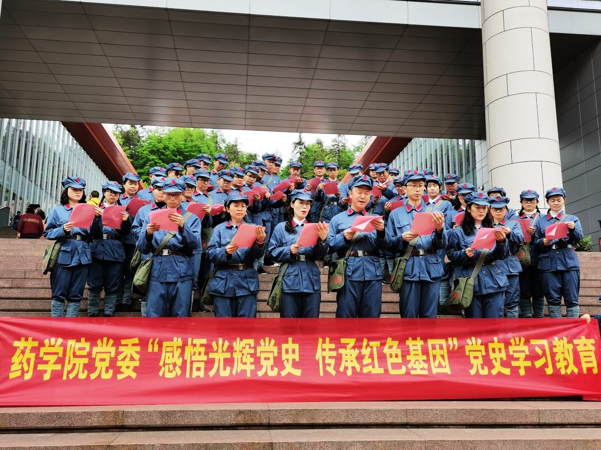 集体诵读。全体人员在井冈山博物馆前严肃认真富有激情地诵读《鲜红的党旗永不褪色》,在大家的诵读声中展现了药学人积极奋进的精神风貌。这是一场激情澎湃、奋发向上的革命洗礼与红色教育。
