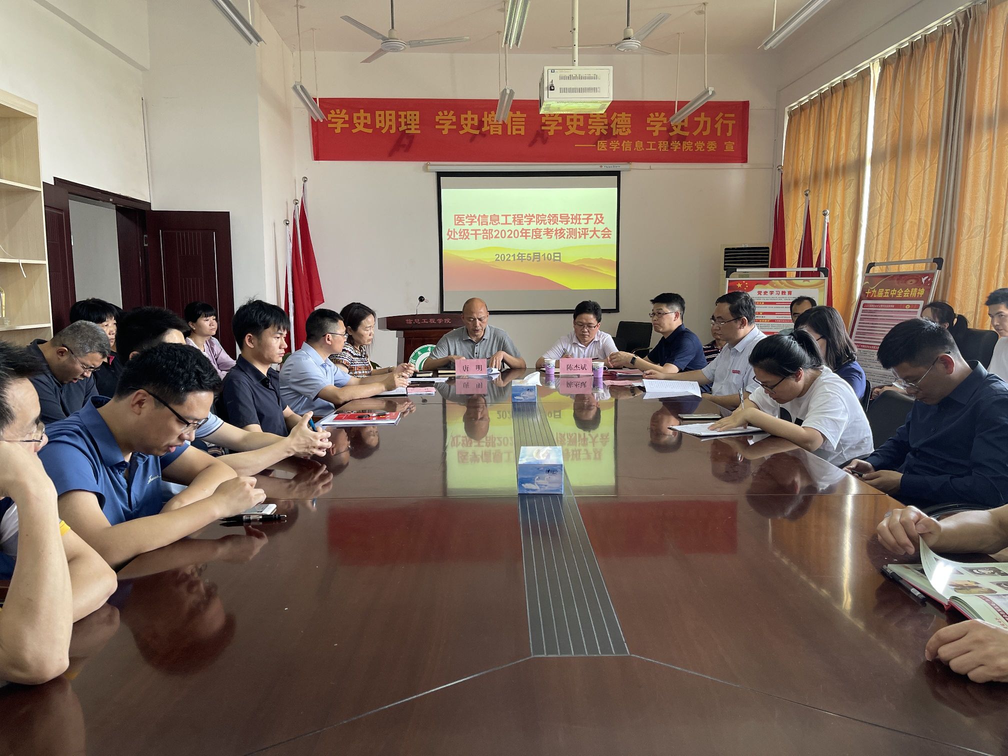 5月10日,医学信息工程学院举行领导班子及领导干部2020年度述职报告大会。学校派出纪委综合办公室副主任陈杰斌、组织部李鉴宇组成测评组全程参与,该院党政领导、教职工和学生代表50余人参会。