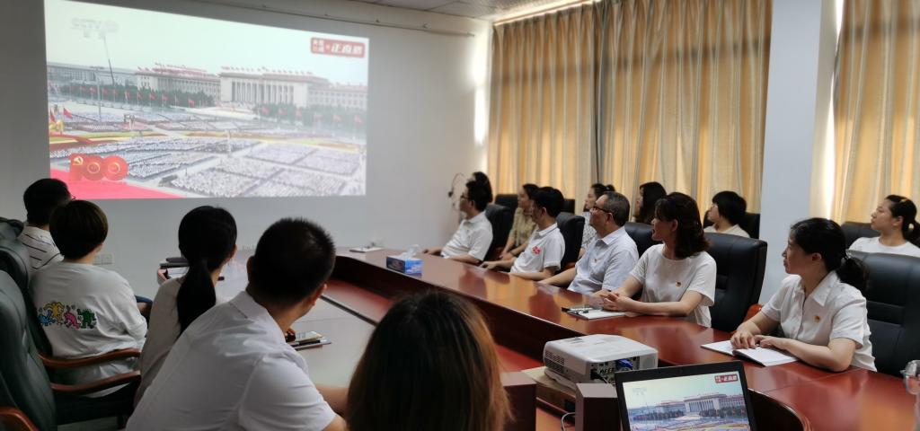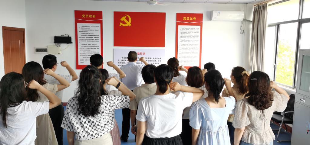 该院全体教工党员在章贡校区党员活动室面向鲜红党旗庄严宣誓。该院党委领导班子为6、7月入党的7名同志献上诚挚的“政治生日”祝福。随后,全院教工一起集中收看庆祝中国共产党成立100周年大会直播。