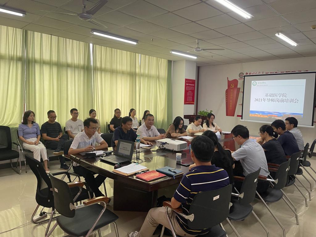 9月7日,基础医学院在黄金校区组织召开了2021级硕士研究生导师岗前培训会,该院院长谢水祥、副院长曹进国参加会议。
