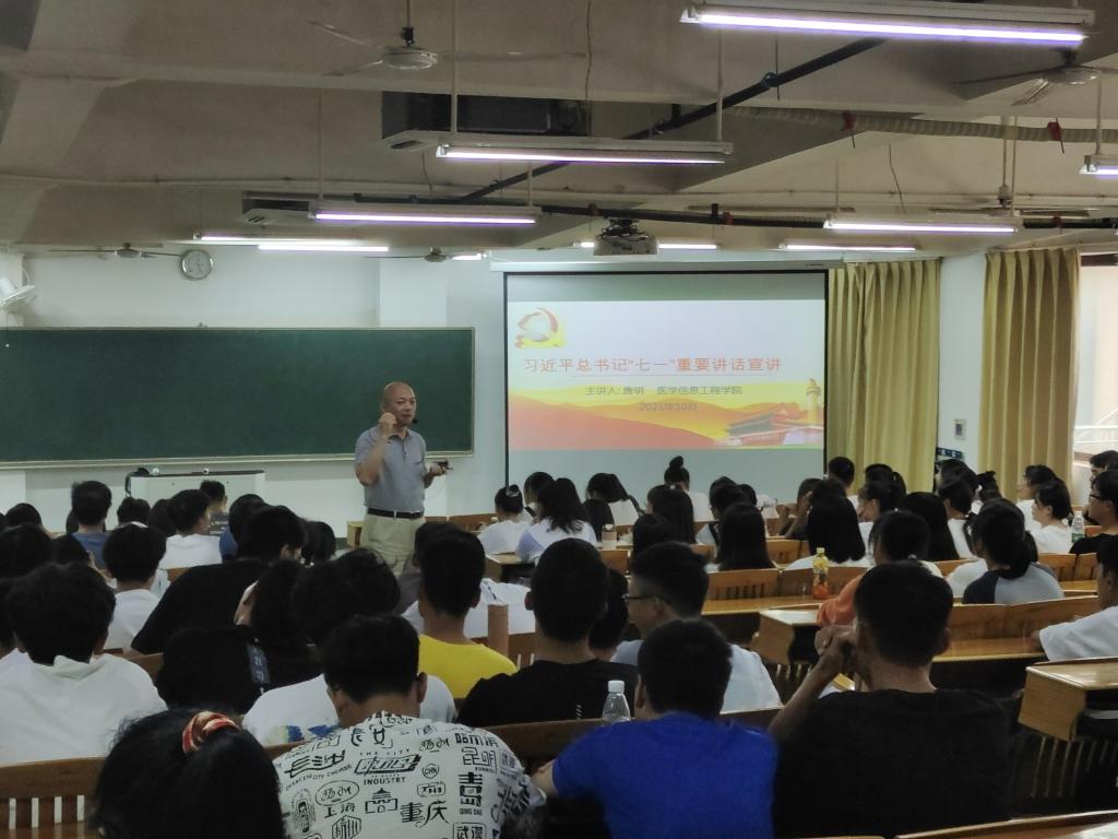 10月9日,医学信息工程学院党委书记唐明在黄金校区为该院2021级学生宣讲“七一”重要讲话精神。