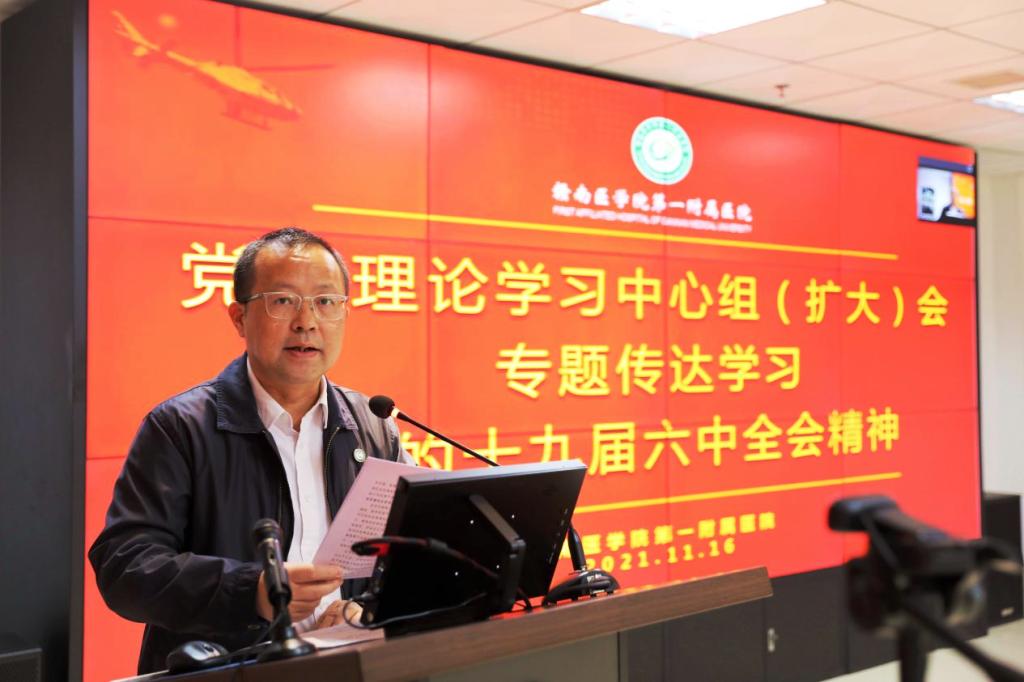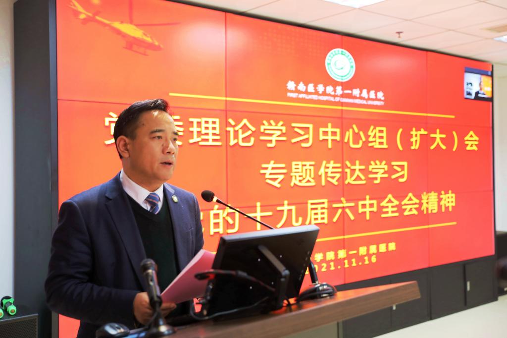 会上,一附院党委副书记徐小军传达了党的十九届六中全会精神。邹晓峰传达了学校党委书记李恭进在全校干部会议上的讲话精神,并结合该院重点工作就贯彻落实好党的十九届六中全会精神作了安排部署。