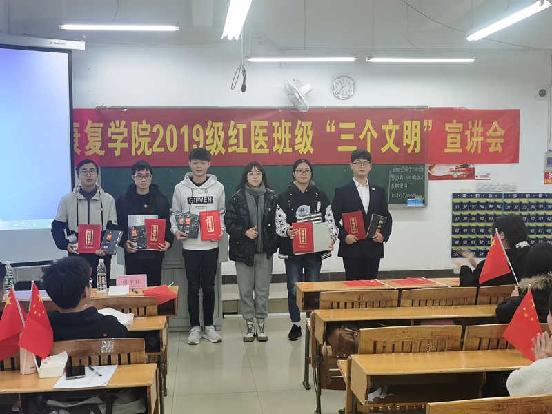 12月13日下午,康复学院2019级红医班级文明宣讲团在黄金校区举行“三个文明”宣讲活动,学工办辅导员、班主任以及全体红医班级同学等参加了活动。