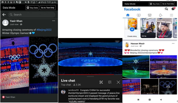 2020级留学生伊布拉从入学开始就深深喜欢中国文化,他在Youtube直播平台留言说,祝贺中国成功举办了2022年冬奥会,北京冬奥会向世界传递了和平、同一个世界、同一个梦想,完美诠释了团结、拼搏的奥林匹克精神。2020级学生艾曼在闭幕式直播平台留言说:“感谢中国为全世界举办了一次如此成功的冬奥会,并无时无刻传递着‘我们在一起’的温馨。”