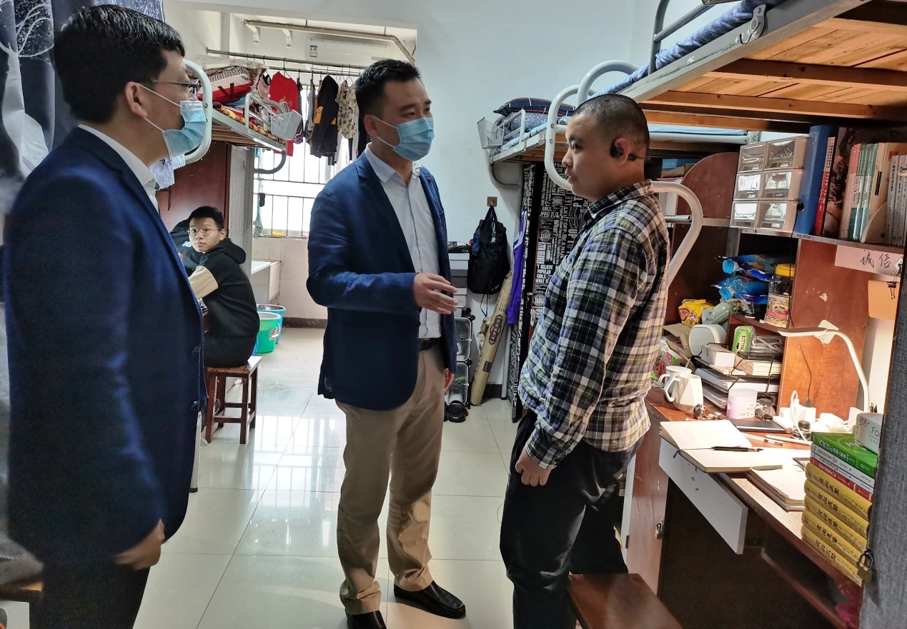 走访过程中,彭磊与同学们交谈,询问学生的学习、生活情况,重点了解在疫情封校期间学生思想动态,对学生宿舍内务卫生、宿舍文化建设及学风建设等进行现场督导。他要求同学们在生活中,严格落实宿舍文明要求,保持宿舍干净、整洁、无异味;并勉励大家努力学习、不断进步,积极培养良好的生活习惯,营造良好的宿舍氛围。