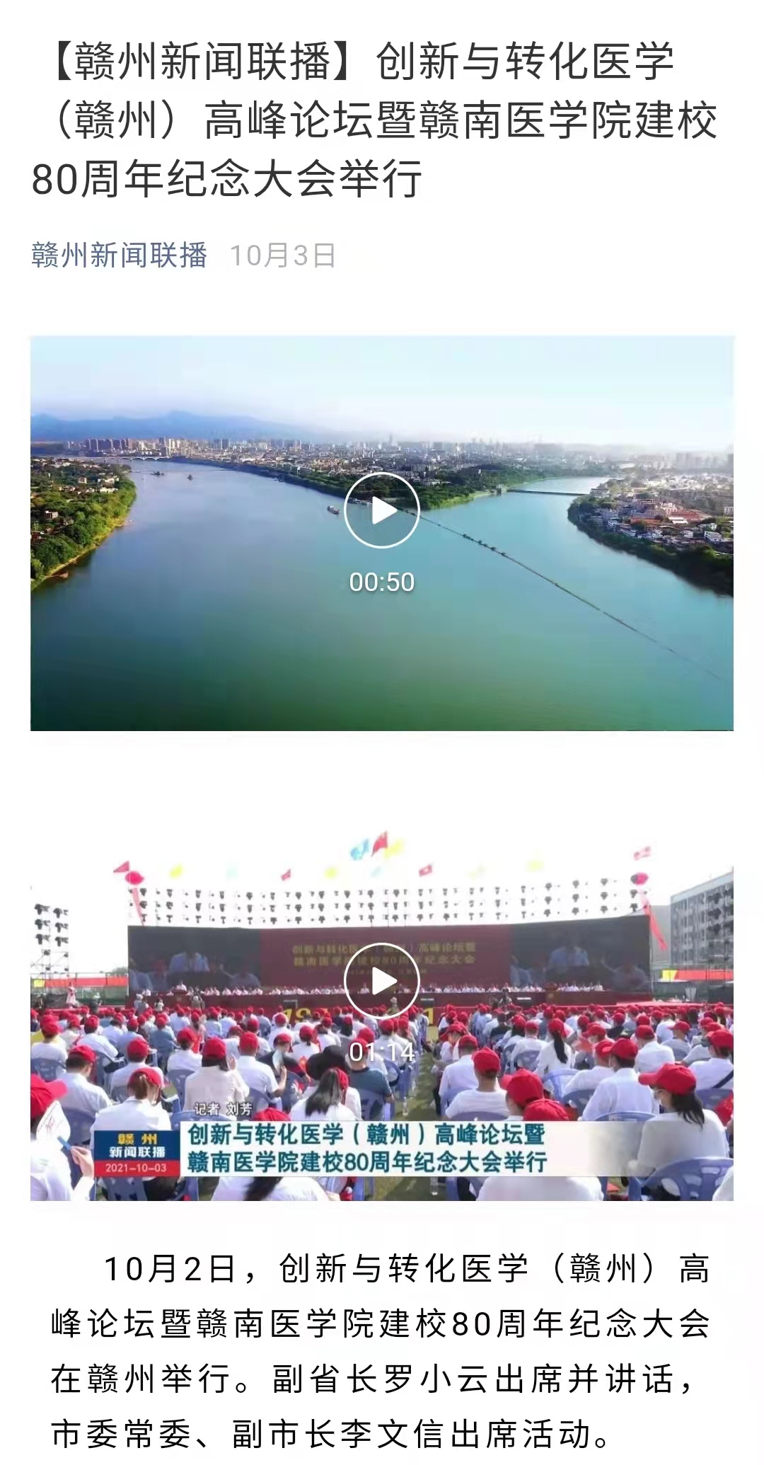 上一篇:《学习强国》:创新与转化医学(赣州)高峰论坛暨赣南医学院建校八十周年纪念大会举行