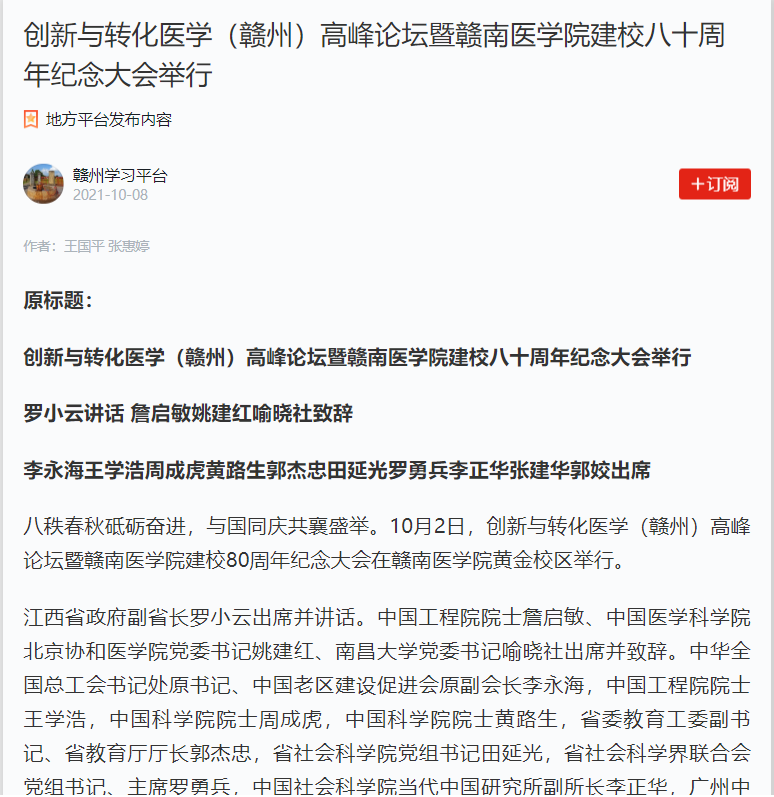下一篇:《学习强国》:创新与转化医学(赣州)高峰论坛暨赣南医学院建校八十周年纪念大会举行