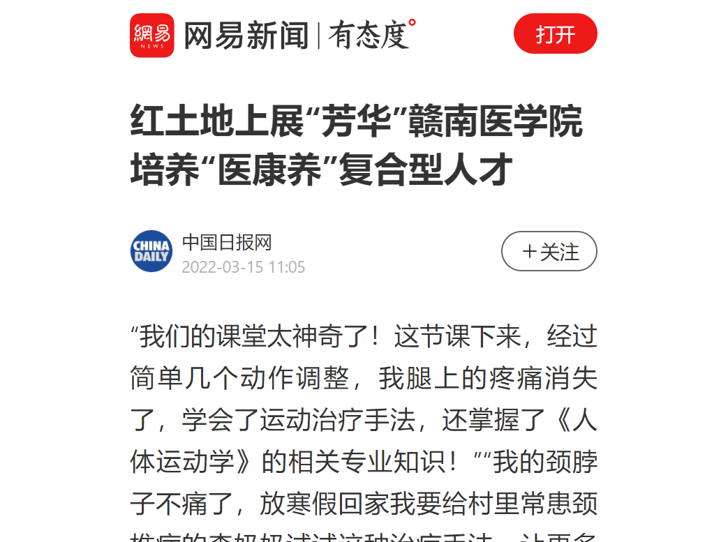 下一篇:《中国日报网》:红土地上展“芳华” 赣南医学院培养“医康养”复合型人才