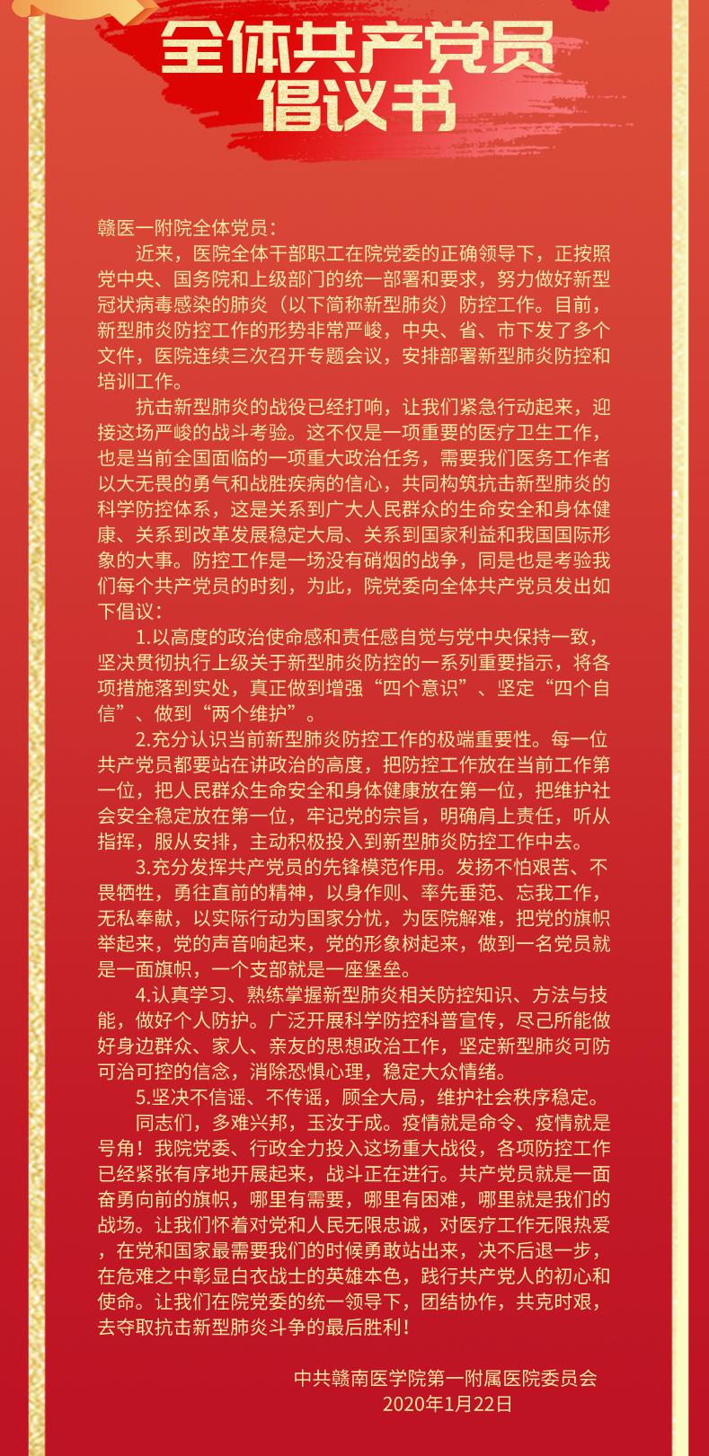 1月22日,该院党委向全体党员发出倡议,号召每一位共产党员都要站在讲政治的高度,把防控工作放在当前工作第一位,把人民群众生命健康放在第一位,把维护社会安全稳定放在第一位,牢记党的宗旨,明确肩上责任,听从指挥,服从安排,主动积极投入到新型肺炎防控工作中去。号召全全党员充分发挥共产党员的先锋模范作用,做到一名党员就是一面旗帜,一个支部就是一座堡垒。