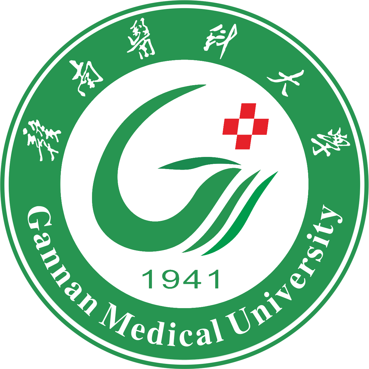 徽志以“赣南医科大学”的英文缩写“GMU”为设计元素,变形为一组奋飞的鹏鸟(鹏鸟由近及远,从而有颜色深浅之分),图形整体似双手捧起红“十”字的情形,图案主体下方“1941”为建校时间,外圈中文校名“赣南医科大学”对比后选用毛体字 (“科”和“大”与原字体样式和笔画粗细相当,形成统一和谐,更是一种传承和接续) 与英文校名“Gannan Medical University”和谐形成一圆形。